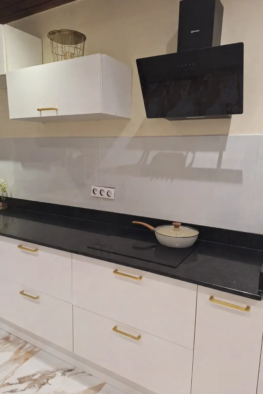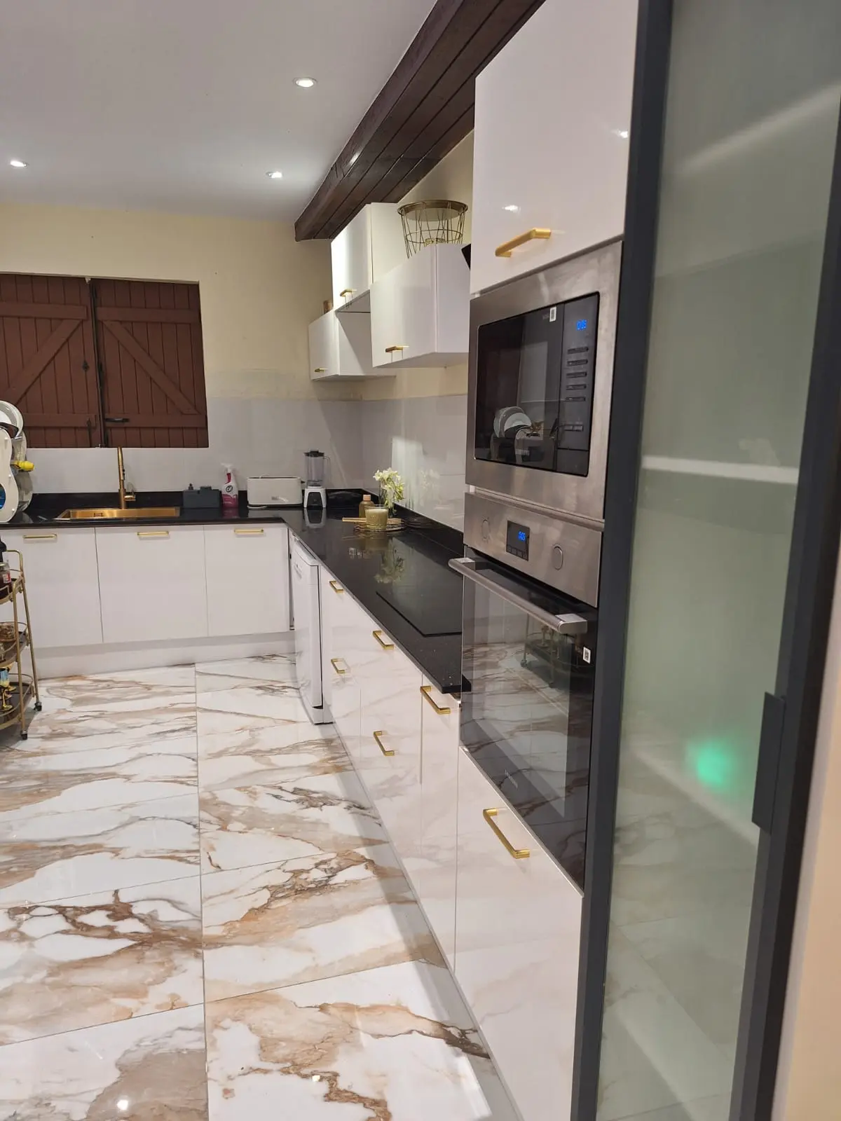 Découvrez cette cuisine blanc brillant, à la fois moderne, lumineuse et raffinée. La touche déco qui fait toute la différence ? Les poignées dorées, pour une finition chic et intemporelle.