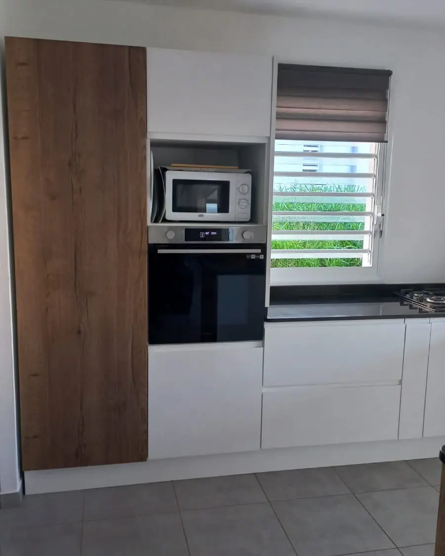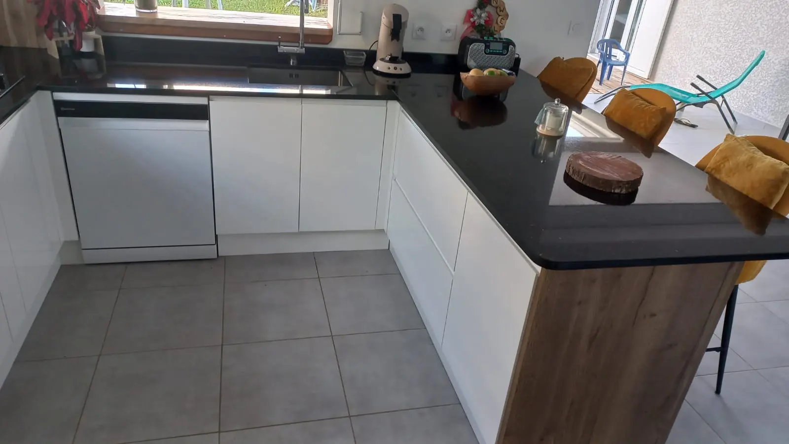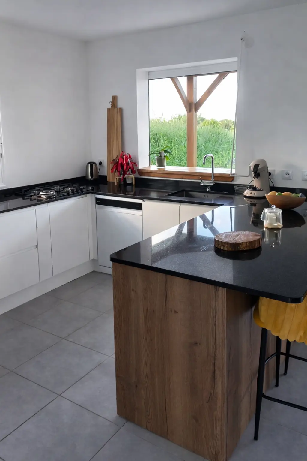Une cuisine blanche et bois avec plan de travail noir, pensée pour être fonctionnelle et conviviale.